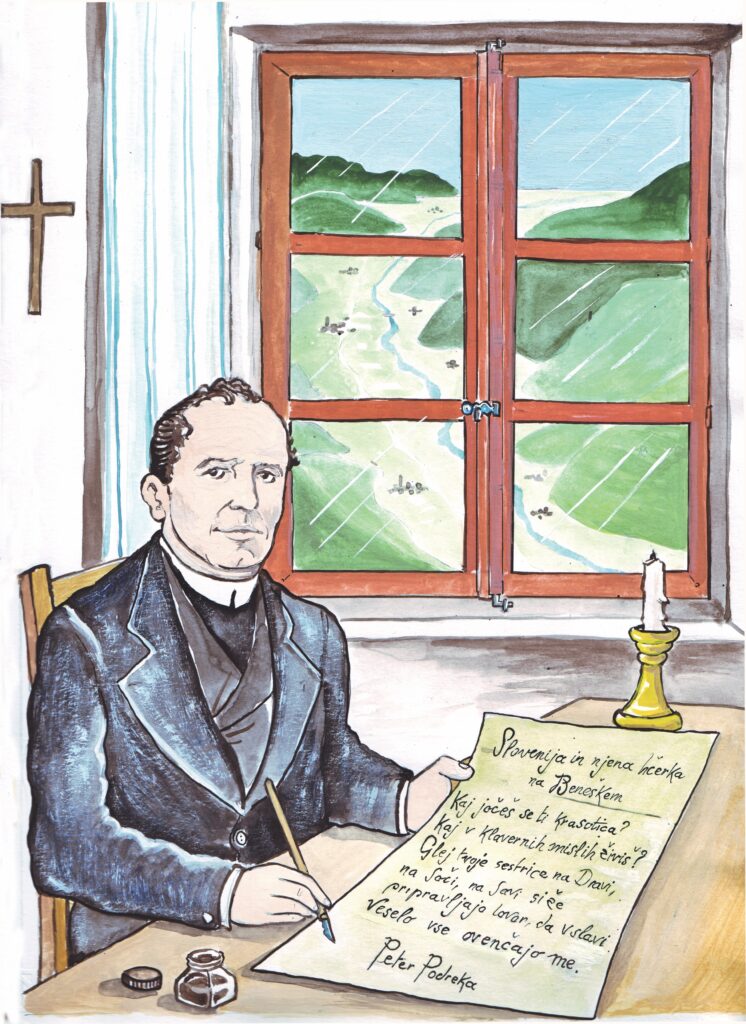 Deluso e amareggiato don Pietro Podrecca sciolse accorati versi denunciando la situazione in cui venne a trovarsi la lingua slovena in Benecia. La già citata poesia dal titolo Slovenija in njena hčerka na Beneškem fu pubblicata anche da Carlo Podrecca nella Slavia Italiana (pp. 127-128) in sloveno con traduzione in italiano. Si tratta di un colloquio tra la lingua madre slovena e la sua figlia esiliata in Benecia. Quest’ultima si lamenta:
